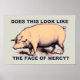 A rather grumpy (disgruntled?) pig, and the words, "Does this look like the face of mercy?" No. No it does not.