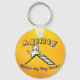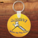 This is an agility themed keychain with a bright yellow background, featuring a dog going over the A-frame, with the text, “Agility Makes My Dog Smile!”.
