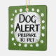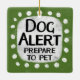 An irreverent and cute typographic animal design that says "Dog Alert, Prepare To Pet". It features black and red text on a white rectangle with funky, playful white dots surrounding it, all on a grey background.