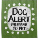 An irreverent and cute typographic animal design that says "Dog Alert, Prepare To Pet". It features black and red text on a white rectangle with funky, playful white dots surrounding it, all on a grey background.