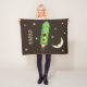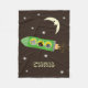 Cute fleece blanket with two dogs and a cat in a green rocket ship flying under the smiling crescent moon. Dark brown background. Personalise with your child's name.