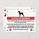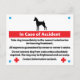 Fully customisable card to attach to your dog's crate or harness in the car, in case there is an accident and you aren't able to deal with your dogs! Replace the black dog silhouette with a photo of your own dog or even add your kennel name/logo. Add your personalised information to the back. Use the blue circles as punch guides and use clips or zip ties to attach to a crate. For extra durability, laminate. Also available in generic bulk form.