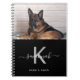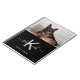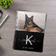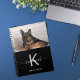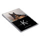 A chic black background. Personalise and add your own photo, a name, monogram letter and a text. The name is written in white with a large modern hand lettered style script with swashes. The monogram letter in grey. To keep the swashes only delete the sample name, leave the spaces or emoji's in front and after the name