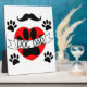 A dog paw print in a red heart with text on a ribbon. Original design with paws and a moustache. A gift idea for men.