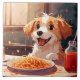 A fluffy white Dog , dappled with brown spots, dives headfirst into a mountain of spaghetti. Tomato sauce splatters across its fur and the white tablecloth in a delightful mess. Rendered in a stunning, masterfully balanced composition (think golden ratio!), the illustration evokes the detailed, yet whimsical
