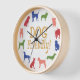 Dog friendly message surrounded by colourful dog silhouettes of different breeds lets everyone know that you love and welcome dogs. Great clock for groomer dog boarding business.