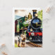 A nostalgic scene of a dog greeting the arrival of a green steam train. Blank Card for any occasion or recipient.