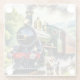 A nostalgic scene of a dog greeting the arrival of a green steam train.