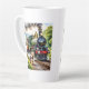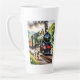 A nostalgic scene of a dog greeting the arrival of a green steam train.