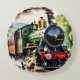 A nostalgic scene of a dog greeting the arrival of a green steam train.