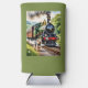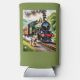 A nostalgic scene of a dog greeting the arrival of a green steam train.