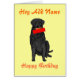 A black dog, holding a birthday present, and Hey Chris (change name) Happy Birthday. Inside message. Fully customisable.