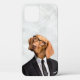 Cute illustration of a dog in a suit and glasses on white marble stone texture