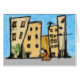 Little brown dog with big buggy eyes, red collar and a yellow snaggle tooth hanging out in the big city. Original digital watercolor cartoon art by Taylor Addams.