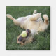 Dog laying upside down in grass with tennis ball magnet