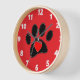 Cute black dog paw print and red heart drawings. Red background version. Custom decorative wall clocks. All that's seen is printed. no actual stitching will be used in the making. Gift idea for women that love dogs.