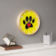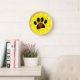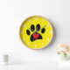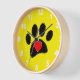 Cute black dog paw print and red heart drawings. Yellow background version. Custom decorative wall clocks. All that's seen is printed. no actual stitching will be used in the making. Gift idea for women that love dogs.