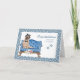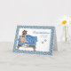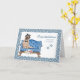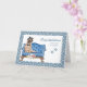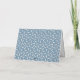 Cute greeting card with a dog on the couch, prom hat, and glasses. The background blue is with a bones pattern