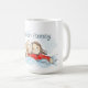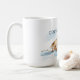 This mug has an illustration of a cute puppy and its parents, a bald man and a brunette woman. You can customise the text.