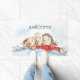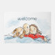 This doormat has an illustration of a cute puppy and its parents, a bald man and a brunette woman. You can customise the text.
