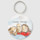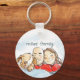 This keychain has an illustration of a cute puppy and its parents, a bald man and a brunette woman. You can customise the text.