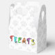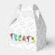 Dog paw print pattern and custom text party decor favour boxes. Custom colourful text for dog related celebrations.