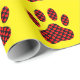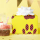 Dog paw print with heart pattern. Original drawing in red and black on yellow background.