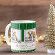 Dog Pet 3 Photo Collage Merry Christmas Coffee Mug. Stylish and modern dog Christmas holiday photo mug with 3 photo collage, Merry Christmas and a custom text. Add three photo. Personalise the text any way you wish or delete it. The background features a green background with white stripes. Great as a Christmas gift or a keepsake mug for yourself.