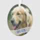 Family pet, dog photo and name Christmas ornament. Acrylic round tree ornament with name template on the front and more custom wording on the back, which is blue with white text.