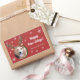 This festive Christmas gift sticker is perfect for all the dog lovers in your life! Featuring an adorable photo of a golden retriever dog wearing a reindeer antler hat against a red background, this fun sticker is sure to bring a smile to everyone's face. The photo may be changed to a photo of your own pup or the pup of your recipient! The background has pretty white snowflakes and editable text that says Happy Paw-lidays. Under the greeting text, add your family name or other text.