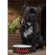 Create your own custom, personalised, bold christmas red rustic vintage western script / typography custom name at front and back, with three stars in the middle and faux gold stars on black background, ceramic, pet dog cat doggy puppy kitten food bowl. Simply enter your pet's name / your text, to customise. Great for birthday, christmas, holidays, new years, and more, for pet dog / cat owners, friends, and family.