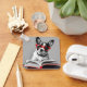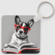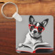 Black and White Picture of a dog Reading a read with a colour splash of red glass frame a book cover