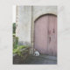 Dog sitting in front of closed doors postcard