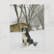 Dog sitting in snow with log cabin behind postcard