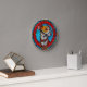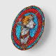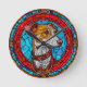 Brightly coloured stained glass panel depicting a dog encircled by intricate chain designs. The vibrant hues of red, blue, and brown accentuate its artistic and expressive appeal, creating a vivid, striking visual.