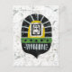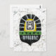 Funny dog mixed media collage with black and white arch, shapes, along with yellow and green accents, all over a textured white background.