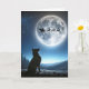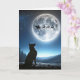 A German Shepherd dog looks up at a full moon where Santa's sleigh and reindeer are silhouetted against a bright full moon