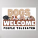 Illustration of a humorous sign featuring various dog breeds, emphasizing a playful message about dogs being welcomed and people tolerated. Perfect for pet lovers and dog-friendly environments.