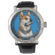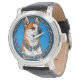 Dog with a chain on a blue background watch