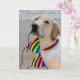 Labrador retriever with colourful striped bikini top in mouth on beach for spouse's birthday