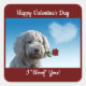 Adorable photo of a cute pooch holding a rose in its mouth, is featured on this square sticker. Sticker reads, "Happy Valentine's Day and I "Woof" You"! A sweet sticker to send on that special mailing, or decorating and scrap booking with. This design is also available as a Valentine greeting card too!