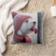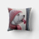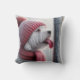 A fluffy white dog in a red knit hat and scarf has its tongue stuck to a frosty metal pole