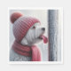 A fluffy white dog in a red knit hat and scarf has its tongue stuck to a frosty metal pole for Christmas.