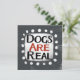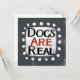 "Dogs Are Real" is a cute text design in grey with black and red text, along with a white accent shape and white textured whimsical dots surrounding it.