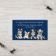 Business cards with dogs design, and animal theme, on dark, navy blue colour. Text is light grey, to customise in two places. Four pups sit along the bottom of horizontal cards and they include, Husky / Malamute, Corgi, Border Collie, and Dalmation breeds. The back of the cards is solid grey.