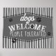 Dogs welcome people tolerated quote has text on original design grey and white background in neutral shades for wall art in dorm, home, or office. Background art copyright Ann Powell all rights reserved .