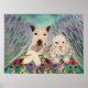 Watercolor memorial of sweet dogs, with multicolored quilt and background of lavender