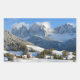 Rectangular photo sticker of the village St. Magdalena (Santa Maddalena) with its church in the Villnoesstal in South Tyrol, Italy, in the snow during winter.