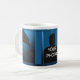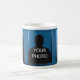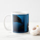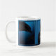A graphic design of dolphins in the deep ocean blue by artist/designer Charmaine Paulson on a coffee mug. The mug has a frame for your photo.