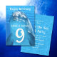 Dolphin face birthday party invitation template, with download option. Blue water and a big smiling dolphin is the design on cards that are meant for a child’s birthday. “You’re invited” text with age in big, curly numbers on the front and more text to customise on the back. Summer water blue colour with white text that is in wavy lettering to match the water theme / under the sea. All party information is added in paragraph form with plenty of space for all information needed. This design also works on some other sizes.